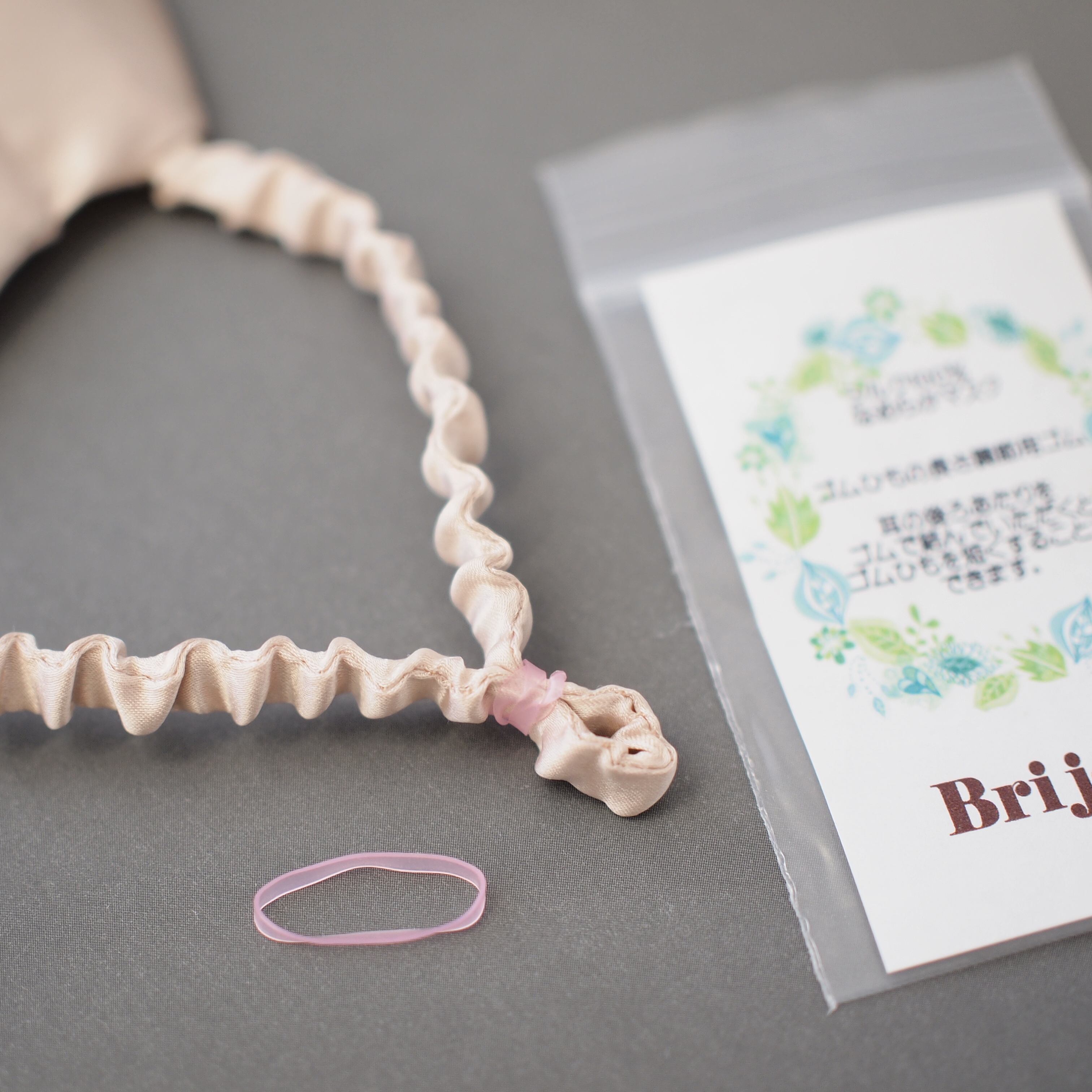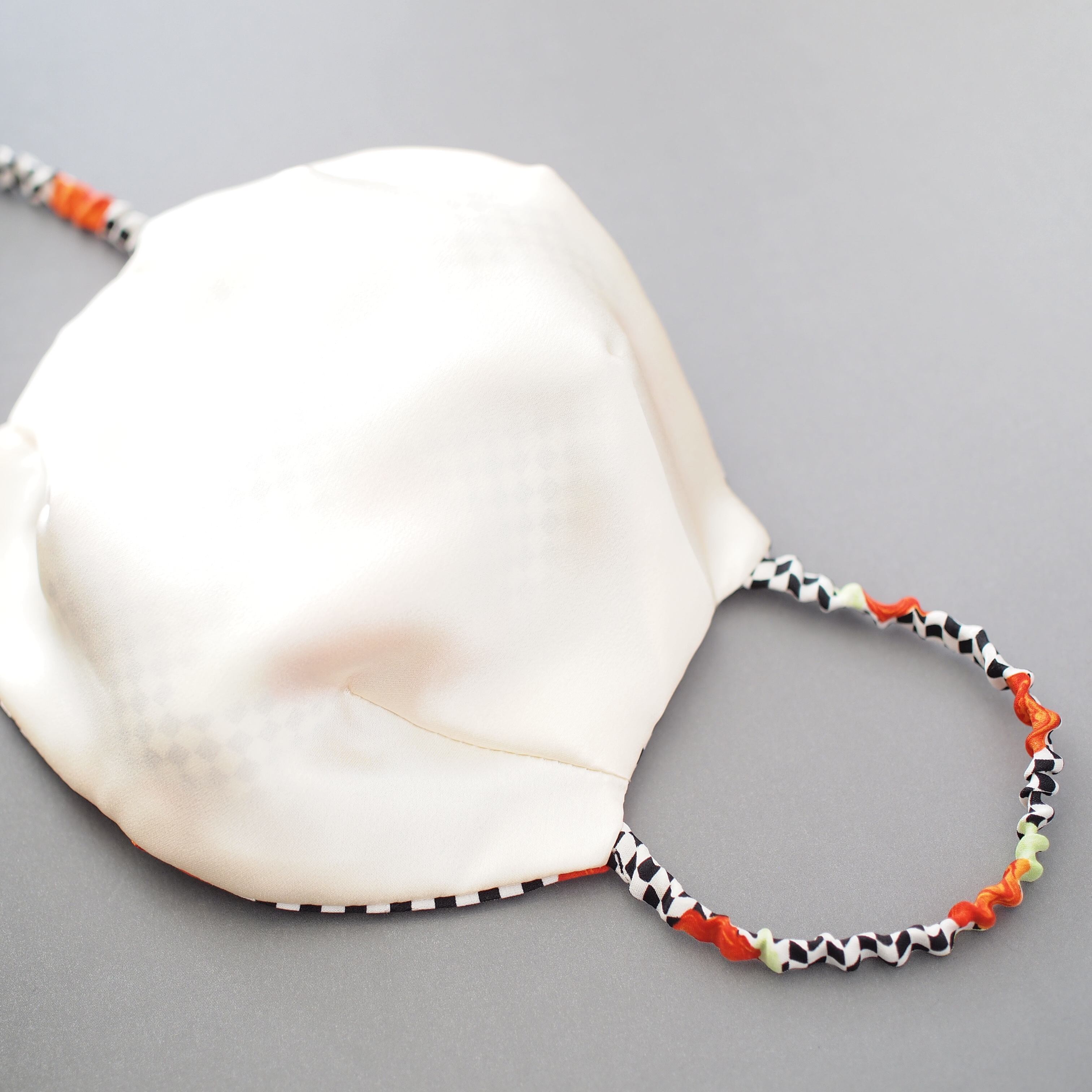 耳にかかるゴム部分も、共布のシルクで包むことで、