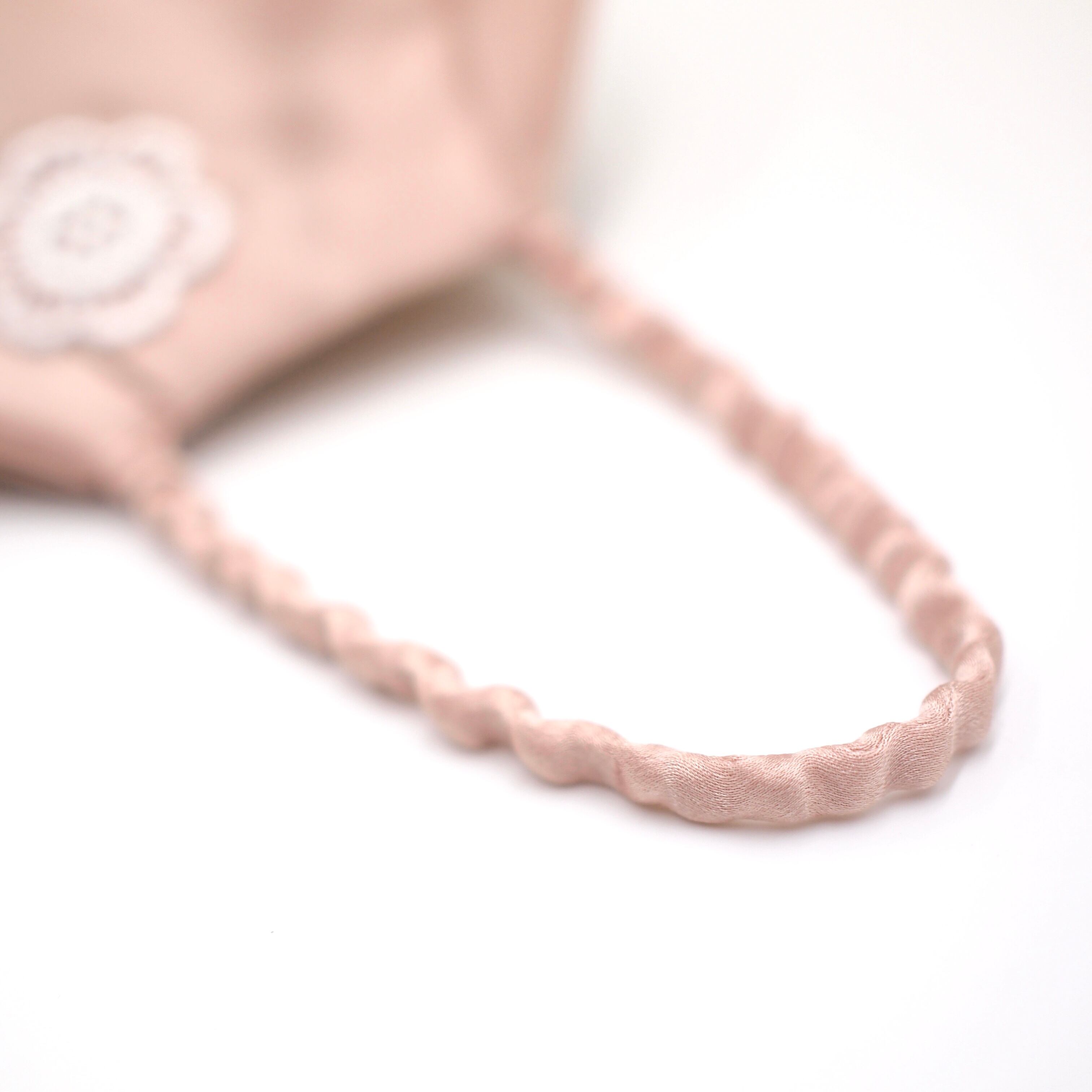 耳にかかるゴム部分も、共布のシルクで包むことで、