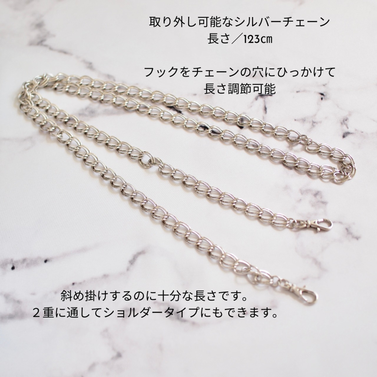 付属のチェーンは長さの調節可能で、斜め掛けでもショルダーでも楽しめるから、シーンに合わせてカジュアルにもエレガントにも♪